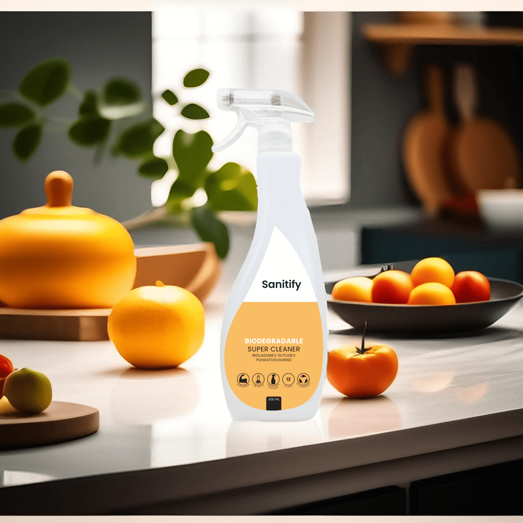 Sanitify biolagunev ülitugev super puhastaja on võimsaim abiline rasva-, õli-, tahma-, nätsu-, värvija muude plekkide eemaldamiseks eri pindadelt.